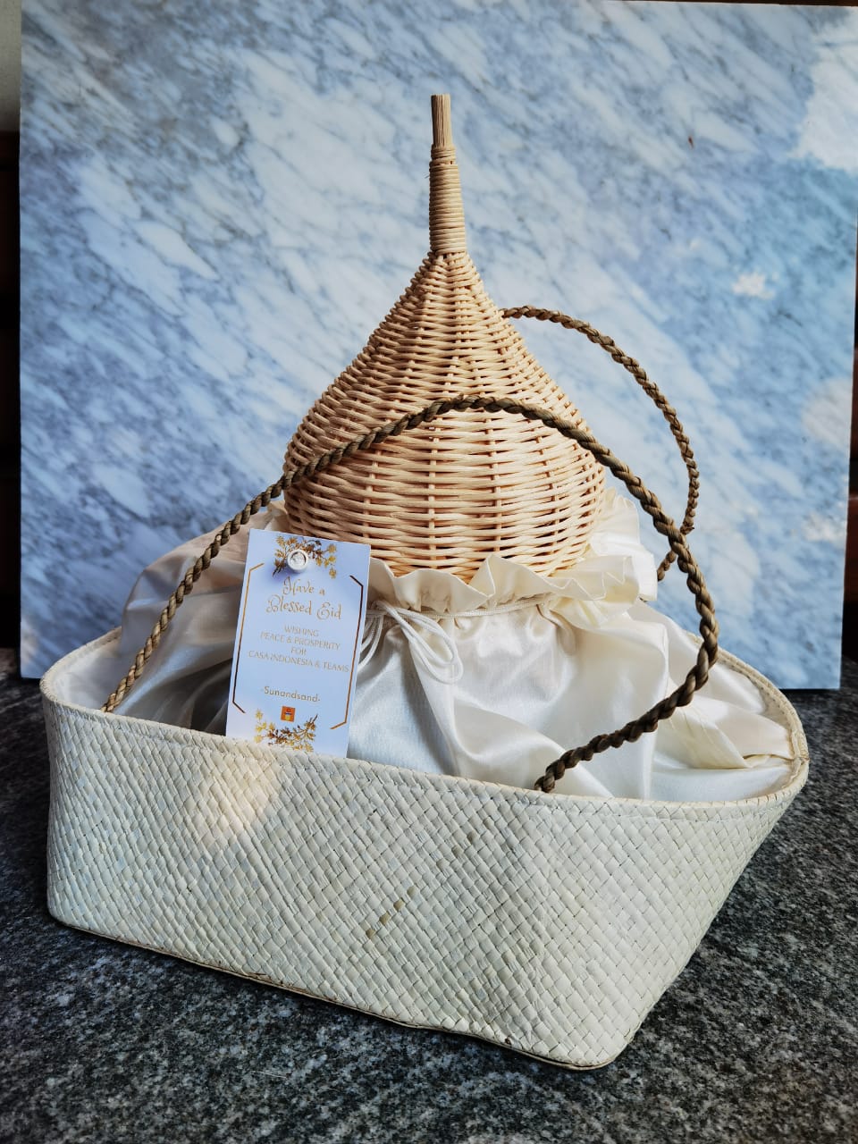 Hampers penuh fungsi ini terdiri dari coaster, placemat, tissue box serta hiasan masjid dan cup rotan yang berisi kurma lapis coklat dengan bungkus yang sustainable.