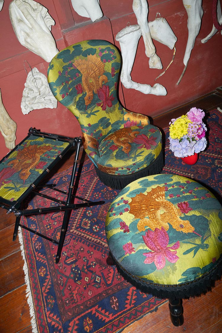 Beberapa koleksi interior menarik yang diluncurkan kali ini adalah selimut dan bantal. Selimut dengan motif bintang ala Gucci terbuat dari wol, kasmir, dan sutra, sementara berbagai bantal juga dibuat dengan material super nyaman dan sangat eye catchy untuk sofa di rumah. Seperti misalnya bantal persegi panjang memiliki alas beludru jacquard yang menampilkan pola GG Daisy dan bagian belakang yang kontras dengan wol tartan, jumbai hitam di sudutnya, dan trim tali hitam. Sementara untuk koleksi furnitur, Gucci juga melansir kursi berlengan dan bangku kaki berlapis bunga. Selain itu, hadir juga peralatan makan berlapis perak yang menampilkan motif kepala singa dan lebah khas Gucci yang akan membuat meja makan Anda begitu semarak.