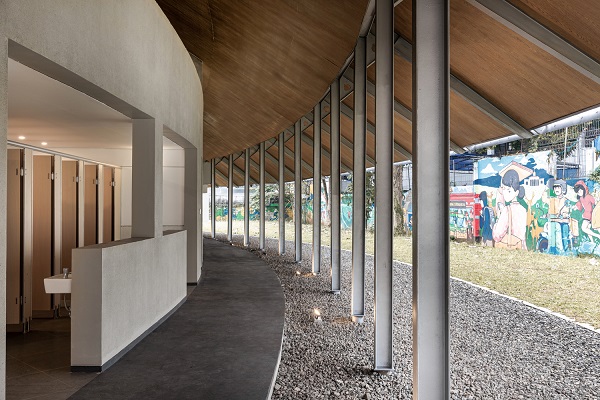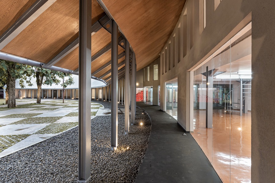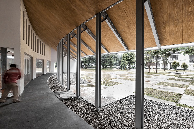Repetisi kolom yang mengelilingi area outdoor di bangunan ini, menciptakan kesan semi tertutup namun tetap memberikan kebebasan menikmati pemandangan taman dari dalam interior. Bagian taman berfungsi sebagai outdoor plaza sekaligus menaungi aktivitas informal di masa mendatang.