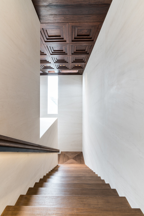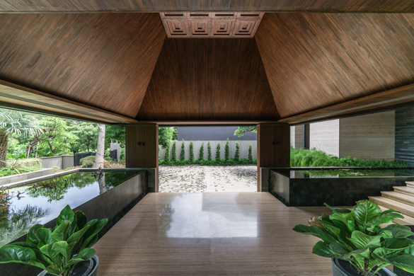 Salah satu desain ceiling kayu tersebut terletak di dining room yang terinspirasi dari ceiling Joglo versi modern. Terpampang selayaknya art piece, marmer dari Italy Statuario pada dinding dan chandelier di tengah dining room menambah statement.