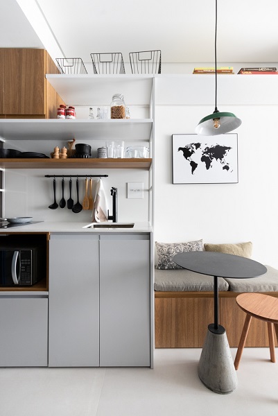 Dalam desain apartemen ini, arsitek memilih untuk menerapkan bench yang menempel ke kabinet dapur sebagai pengganti kursi meja makan. Bench ini dilapisi dengan bantal sebagai dudukan dan di bawahnya dimanfaatkan menjadi lemari.