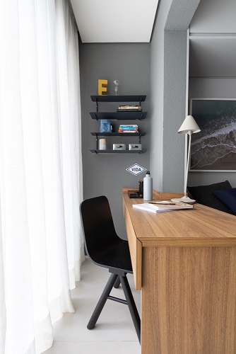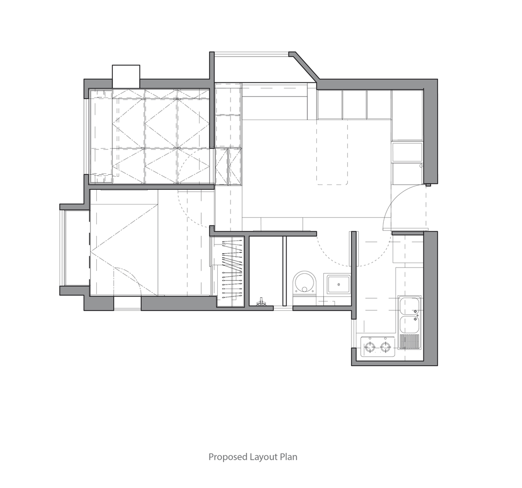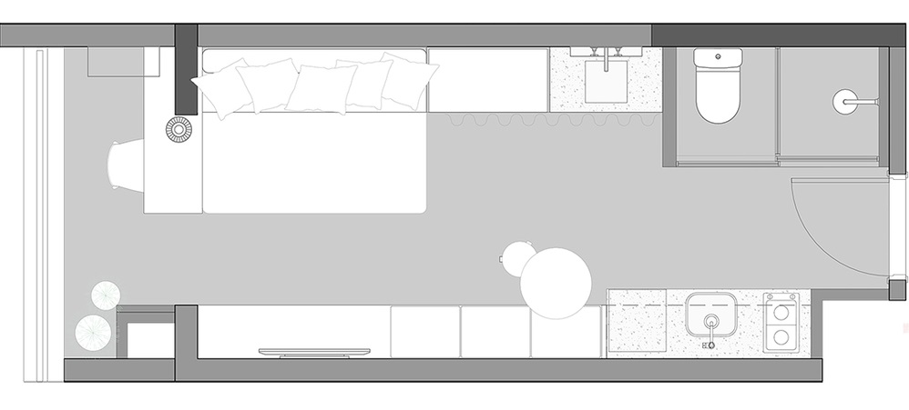Para single ladies ataupun gentleman bisa menerapkan denah apartemen yang diciptakan oleh Todos Arquitetura ini. Unit apartemen ini memiliki luas 19 m2 dengan entrance yang langsung disambut dengan area kamar mandi serta pantry.