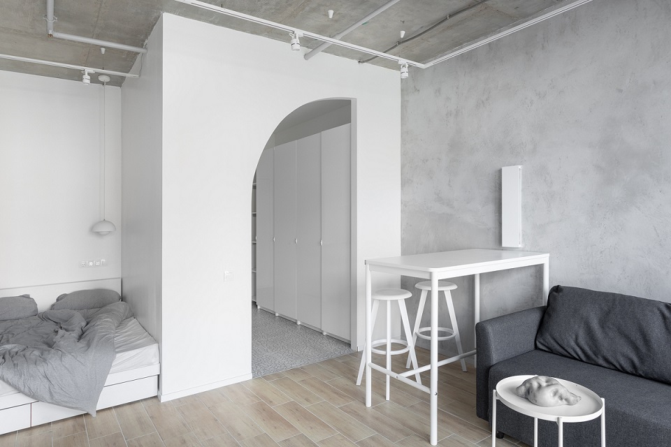Less is more adalah tagline patut dicamkan dalam memikirkan denah apartemen tipe studio. Contohnya saja unit apartemen yang dirancang oleh SHKAF interior architects dengan luas ruangan 33 m2. Dengan ruangan berbentuk persegi, arsitek hanya menempatkan furnitur esensial di apartemen ini.
