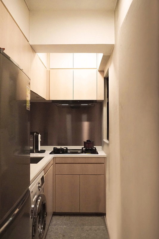 Seolah tidak ingin menyia-nyiakan ruang yang ada, bagian atas pintu masuk pun juga dijadikan lemari yang bersambung dengan ruang makan. Lalu, untuk dapurnya sendiri, turut dilengkapi dengan mesin cuci yang kerap dilakukan di apartemen, yaitu menggabungkan area memasak dengan laundry guna menghemat ruang.