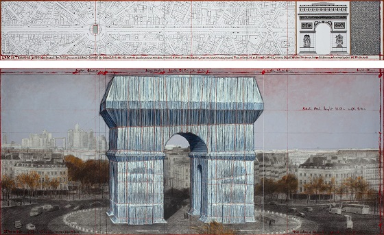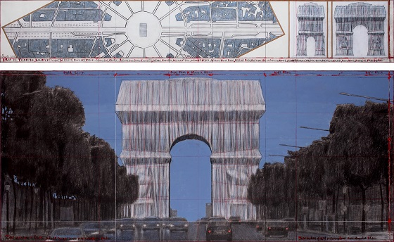 L’Arc de Triomphe, monumen yang terletak di Paris ini dibuat terbungkus oleh 25.000 meter persegi polypropylene fabric, sebuah thermoplastic yang dapat didaur ulang berwarna biru silver dan diikat oleh 7.000 meter tali berwarna merah. Ini menjadi karya dari seniman Christo dan Jeanne-Claude yang sudah pernah membungkus bangunan-bangunan publik besar lainnya.