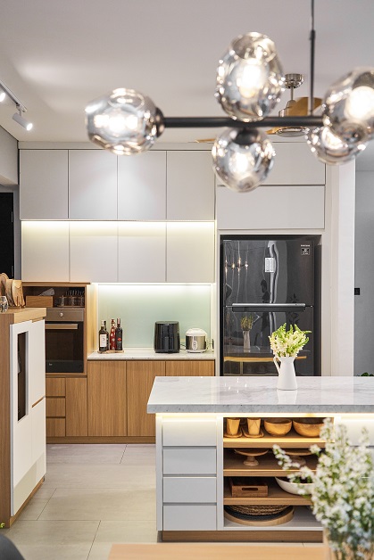 Saran CASA Indonesia: Agar meminimalasir bahaya seperti, melukai jari saat memotong sayur atau masakan gosong saat menggoreng bakwan akibat penerangan yang gelap, pasang in-Lite Strip Light INFS001 dengan tipe warna Warm White di bagian bawah kabinet atas.