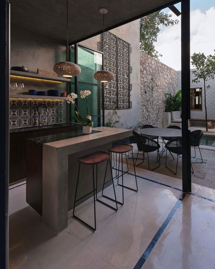 Jika Anda memiliki lahan kosong di dekat teras belakang rumah, Anda bisa memanfaatkannya sebagai area mini bar semi outdoor. Di sini Anda bisa menikmati santapan atau minuman sambil menatap suasana luar ruangan. Tambahkan hiasan berupa pot tanaman maupun lampu gantung yang membuat mini bar semakin hidup.