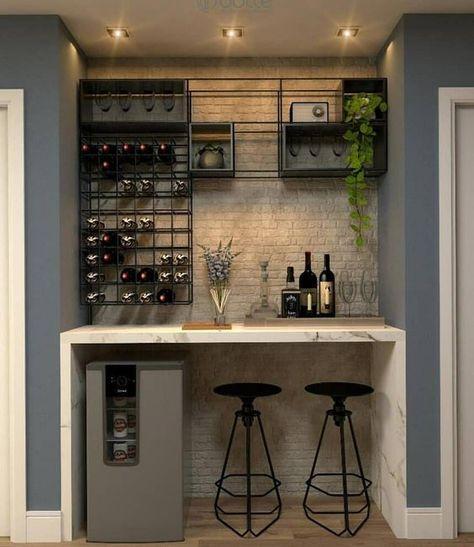 Desain mini bar mengusung gaya industrial bisa sangat eye catching dan menciptakan kesan unik tersendiri. Gunakan dinding bata ekspos putih dan rak dinding untuk botol wine yang terbuat dari material besi — khas interior gaya industrial. Letakkan tanaman hijau di rak gantung tersebut untuk menciptakan kesan hidup dan segar.