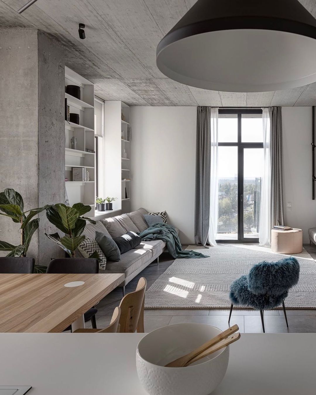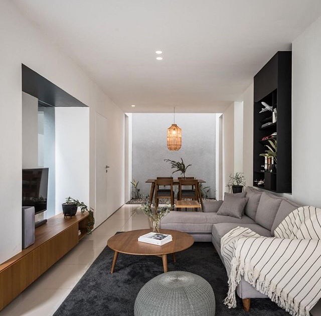 Warna abu-abu muda memiliki efek yang sama dengan warna putih saat diaplikasikan pada ruangan. Sama halnya dengan warna putih, warna abu-abu muda akan memantulkan panas sehingga membuat ruang tamu terasa lebih sejuk dan menciptakan suasana tenang. Padukan dengan sofa warna senada dan beri sentuhan tekstur kayu yang bisa membuat ruangan terasa lebih warm dan hidup.Â