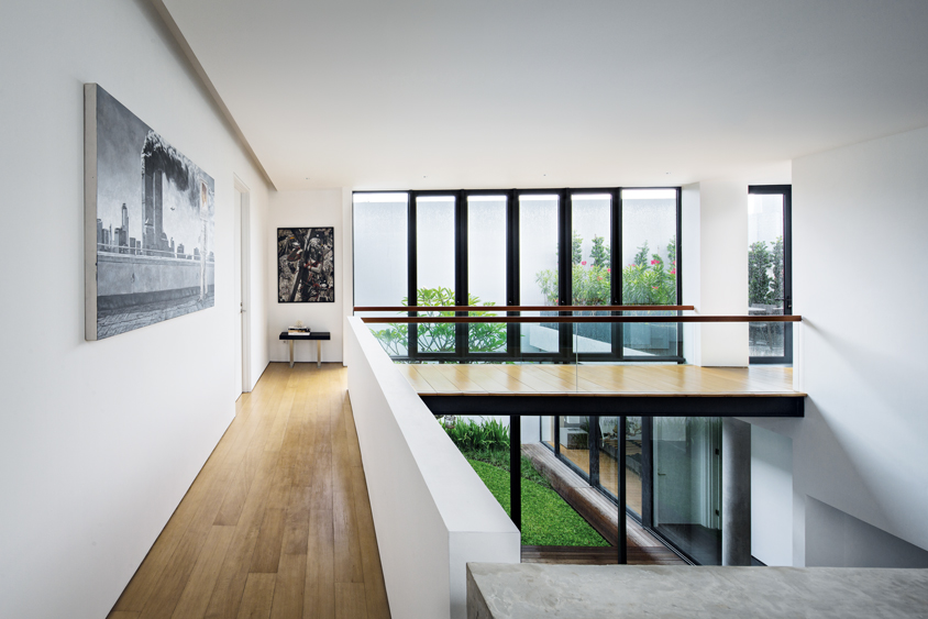 Untuk memberikan udara dan pencahayaan alami di dalam rumah, menghadirkan void itu juga penting. Void setinggi 5,5 meter di tengah-tengah rumah seluas 554 meter persegi ini dirancang sebagai pembentuk ruang, sekaligus celah bagi cahaya alami.