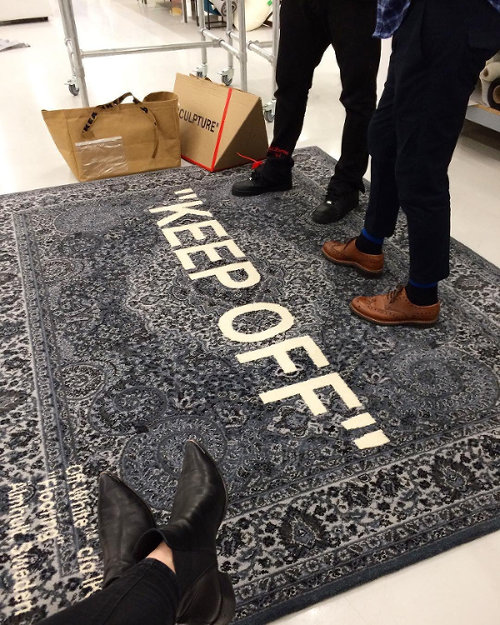Varian karpet muncul dalam look beragam, mulai dari motif paisley hingga palet merah dan biru vibran yang sama-sama disisipkan quote khas label pribadinya, Off-White.