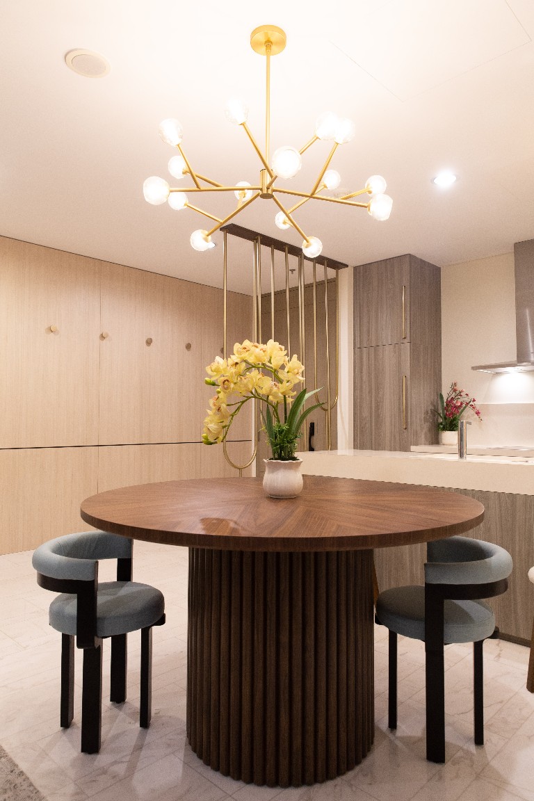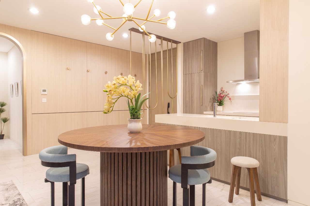 Bersandingan dengan jendela apartemen yang luas, area living room dan dining room menjadi area favorit. Dengan pemilihan yang efisien, Milieu Studio hanya menempatkan beberapa furnitur agar ruang gerak lebih lega. Desain meja makan yang dilapisi oleh kayu Walnut Teakwood ini menjadi centerpiece yang hangat.