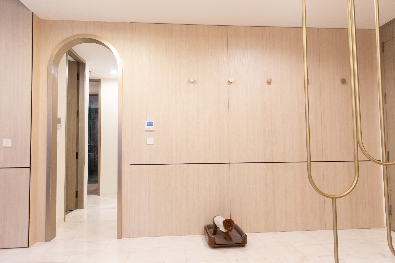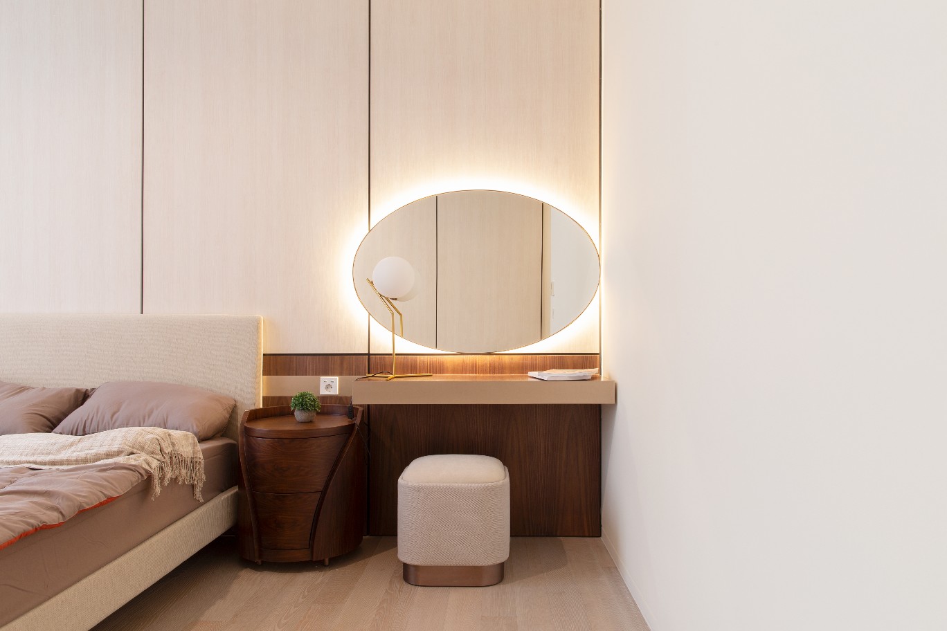 Secara selaras, Milieu Studio menggunakan bentuk tersebut pada partisi, wall treatment di hallways, cermin rias, serta elemen interior lainnya. Energi dan kesan yang hangat juga ditampilkan melalui pemilihan material natural, seperti oakwood, teakwood, beige marble. Untuk menambahkan kesan elegan, Milieu Studio memberikan sentuhan brass dan tekstil pilihan di beberapa sudut.