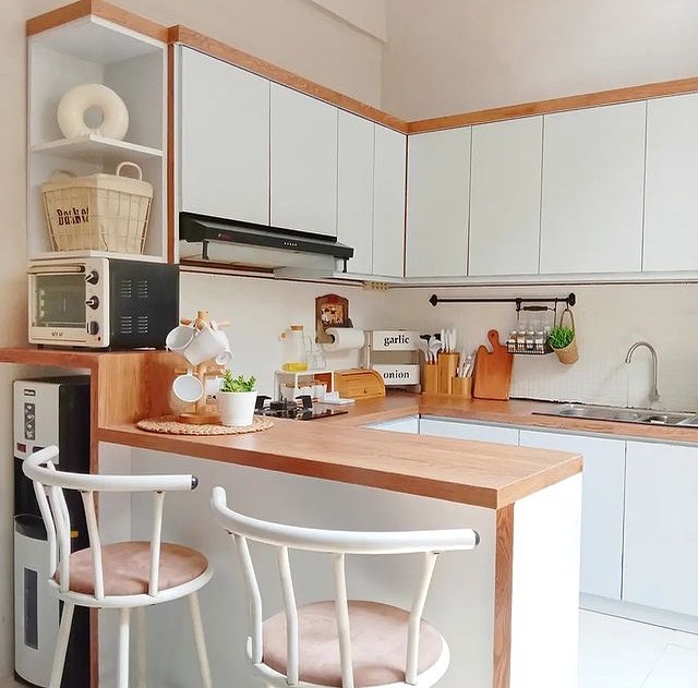 Countertop bermaterial kayu bisa menjadi pilihan bagi Anda, terutama jika rumah Anda berkonsep minimalis, scandinavian, atau japandi. Ini akan menghadirkan kesan hangat dan natural pada dapur Anda.Â