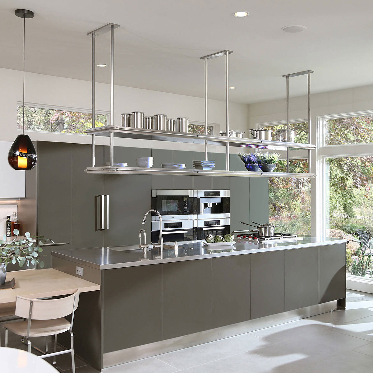 Untuk tampilan dapur yang benar-benar kontemporer dan industrial untuk countertop dapur Anda, stainless steel adalah pilihan material yang tepat. Meja dapur dengan material stainless steel dinilai lebih tahan panas, tahan lama, tahan kuman, dan mudah dibersihkan. Namun, stainless steel mudah untuk tergores, sangat mahal untuk dibuat, noisy, dan bisa berkarat jika tidak dirawat dengan benar.Â