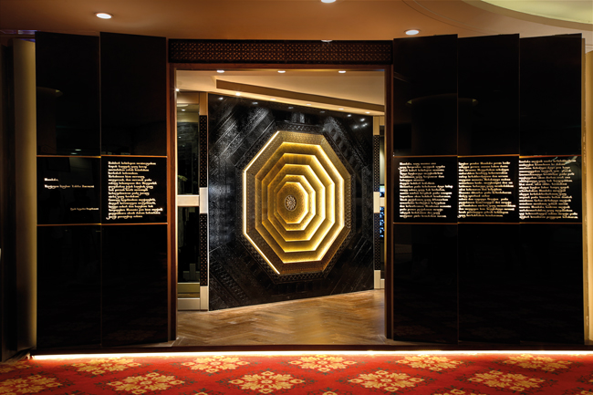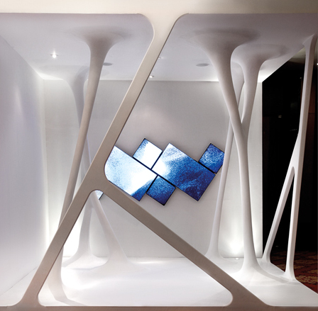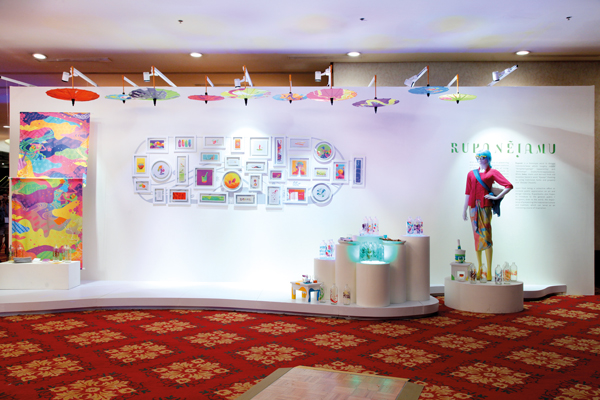 Gambaran tersebut diwujudkan melalui wall treatment cermin dan plywood berlapis foto karya Dewi Adnyani dan anyaman polietilen berbentuk dua pohon keropos di atas lantai berpasir putih.