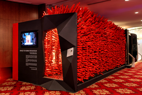 Cosmas D. Gozali merancang space-nya dengan rangkaian 4.400 bambu dengan tengan teknik tradisional dan menggunakan sumpit bambu sebagai pasaknya. Melalui karya yang diberi judul Space To Human Behavior ini, Cosmas ingin bercerita mengenai perjalanan interaksi manusia dengan alam.