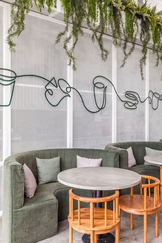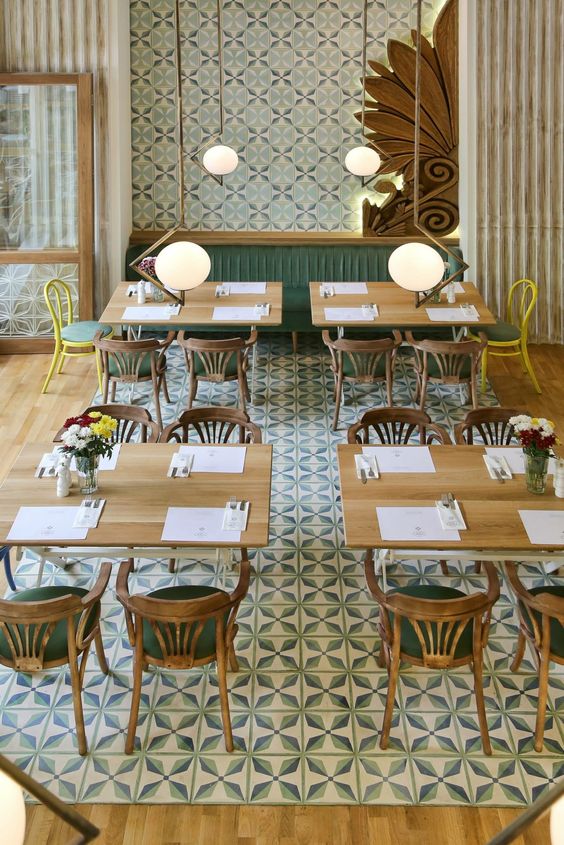 Anda dapat mengaplikasikan elemen ini pada motif lantai, mural di dinding, signage (penanda arah) pada spot tertentu, permainan typography, dan lain sebagainya. Elemen-elemen ini tentu dapat meningkatkan kualitas interior restoran Anda dan bisa semakin memikat pelanggan terutama dari segi visual restoran.