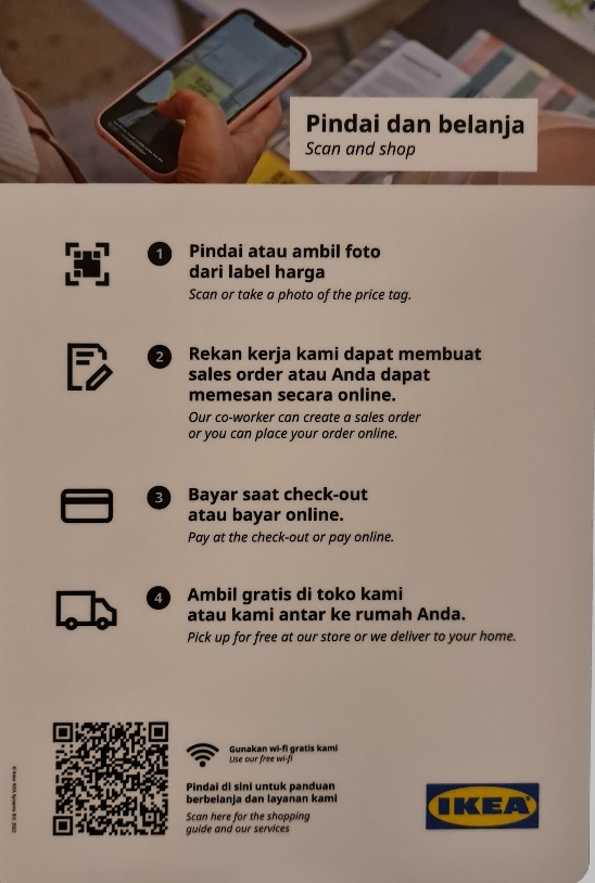 Tips AlaCASA: Scan and buy! IKEA Mall Taman Anggrek menawarkan sistem hybrid (offline dan online). Langsung foto kalau ada furnitur dan barang menarik, nama, dan tag-nya agar Anda bisa dengan mudah menemuinya lagi seusai berputar mengitari toko IKEA. Atau bahkan membelinya melalui official website IKEA.Â