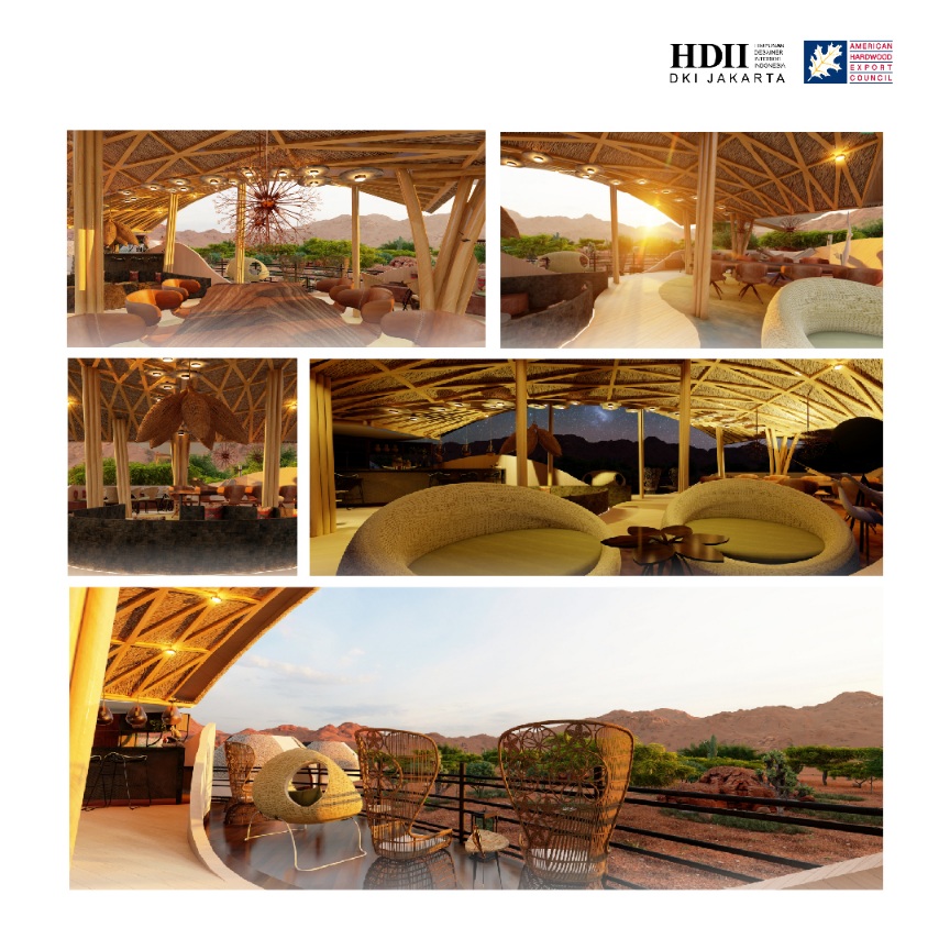 American red oak hadir dengan versatile dalam karya ciptaan Abdurrohim. Kayu tipe red oak diterapkan sebagai struktur ceiling sedangkan tipe white oak hadir pada eksterior. Penerapan ini untuk menampilkan pengalaman ruang seperti sedang berada di sebuah african safari lodge yang menjadi inspirasi utama sang desainer.