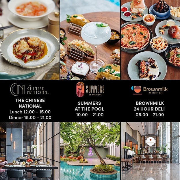 Swissotel memberikan empat pilihan kuliner yang bisa Anda santap dari pagi hingga malam. Pertama, Anda bisa menikmati kue, sandwich, pizza, minuman panas/segar di Brownmilk Deli yang buka 24 jam (jam operasional berubah selama pandemi, yaitu 21:00).