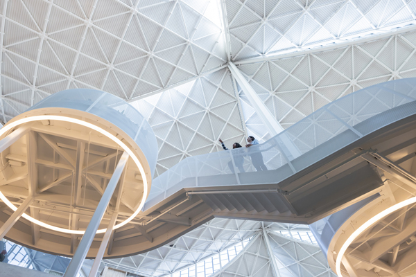 Inilah yang mendasari prinsip desain biophilic yang diterapkan pada seluruh gedung. Pada bagian eksterior fasad, desainer menerapkan kurang lebih 50.000 dragonscale solar skin panel yang terintegrasi dengan geothermal piles di bawah kantor. Dengan demikian energi yang terserap dapat mendinginkan saat cuaca panas dan menghangatkan ruangan ketika cuaca dingin.
