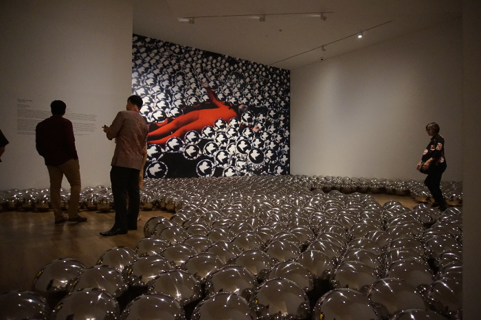 Masuk lebih jauh ke dalam pameran, Anda perlu berhati-hati dalam melangkah karena akan dikejutkan dengan karya ikonis Yayoi Kusama yaitu The Narcissus Garden (1966/2018). Karya ini pertama kali ditampilkan oleh Yayoi Kusama di Venice Biennale ke-33 (1966) dengan intensi sebagai kritik atas produksi, pameran dan sirkulasi seni dalam komersialisasi yang terus meningkat.
