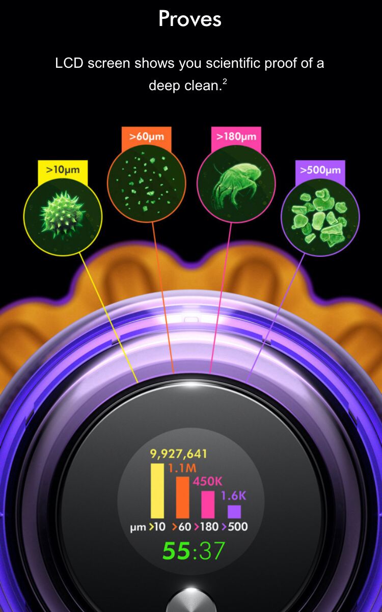 Berbeda dengan Vacuum Dyson generasi sebelumnya, kini LCD Screen Dyson V15 bisa menunjukan data yang tersedot selama pengguaan serta mengkategorikan partikel.