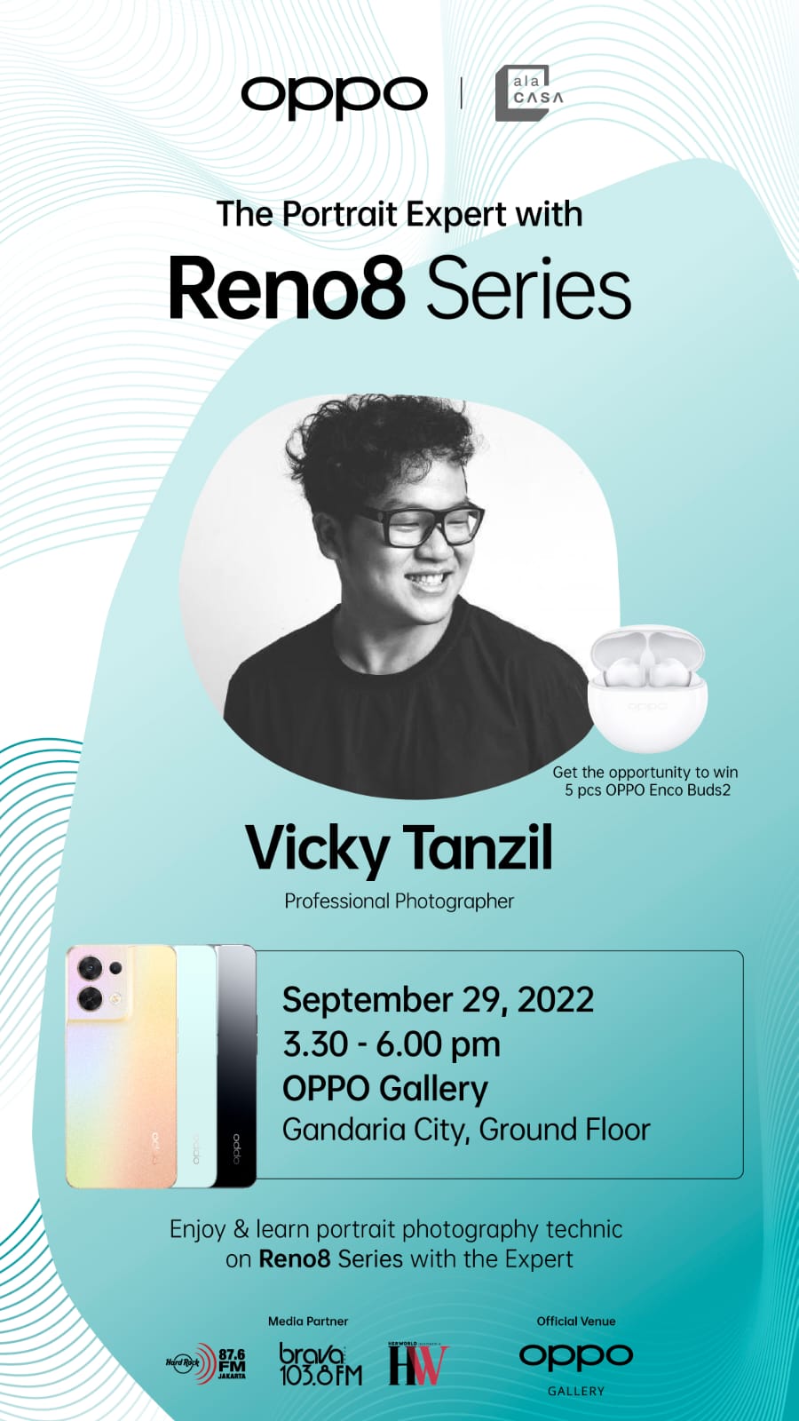 Dalam acara The Portrait Expert OPPO RENO8 Series Photography Community yang berlangsung di Oppo Gallery Gandaria City, OPPO berkolaborasi dengan AlaCASA untuk discussion dan sharing session Photography dengan expert Vicky Tanzil, membahas bagaimana smartphone ini sangat cocok untuk membuat konten.Â
