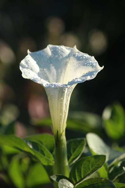 Tanaman Jimson Weed, atau dikenal juga dengan Kecubung, adalah tanaman hias yang memiliki bentuk bunga unik seperti terompet berwarna putih.