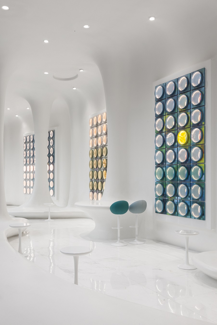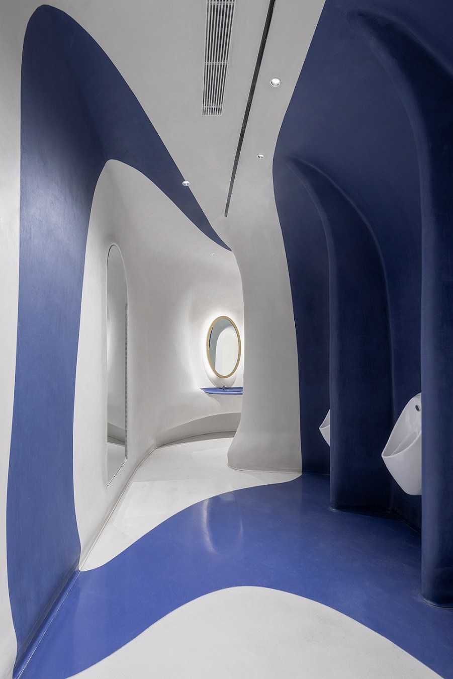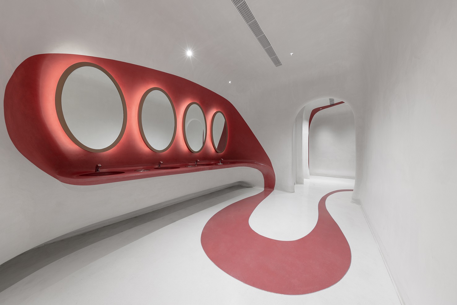 Menciptakan kesan khas dari Glacial Water Retail, X+Living merancang struktur dari lorong menyerupai pepohonan dan sungai yang mengalir tanpa suara. Desain kamar mandi ikut diberi aksen megah dengan penaruhan patung Athena di depan pintu masuk dengan lukis lantai merah dan putih secara berkelok di dalamnya. Â