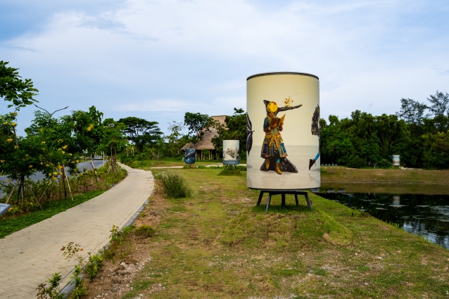 20 karya ini dibuat di Bali dan dicetak secara digital di atas kain yang terbuat dari plastik daur ulang kemudian diaplikasikan pada 10 instalasi menyerupai drum yang digerakkan oleh energi matahari.
