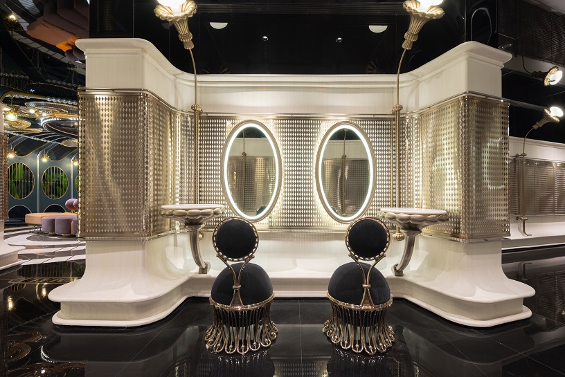 Di ujung ruangan baru terlihat pemisahaan kamar mandi pria dan wanita, saat mengantri pun disediakan sekelompok sofa untuk para pengunjung beristirahat. Keunikan desain lainnya, terlihat pada wastafel layaknya air mancur di taman menggunakan veener kayu dan kisi-kisi berwarna gold memberikan kesatuan gaya artistik dan estetika tema.