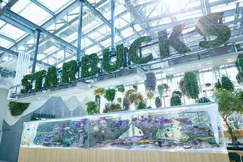 Berkonsep bangunan menyerupai greenhouse, tulisan Starbucks terbuat dari tanaman hijau segar mencuri perhatian sesaat melangkah menuju area depan bangunan.
