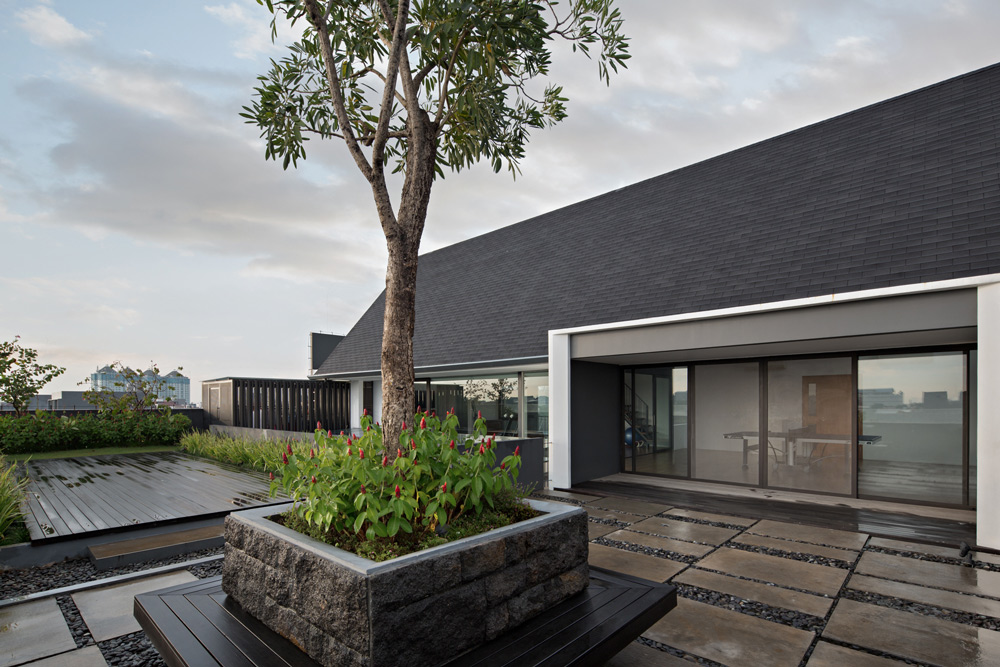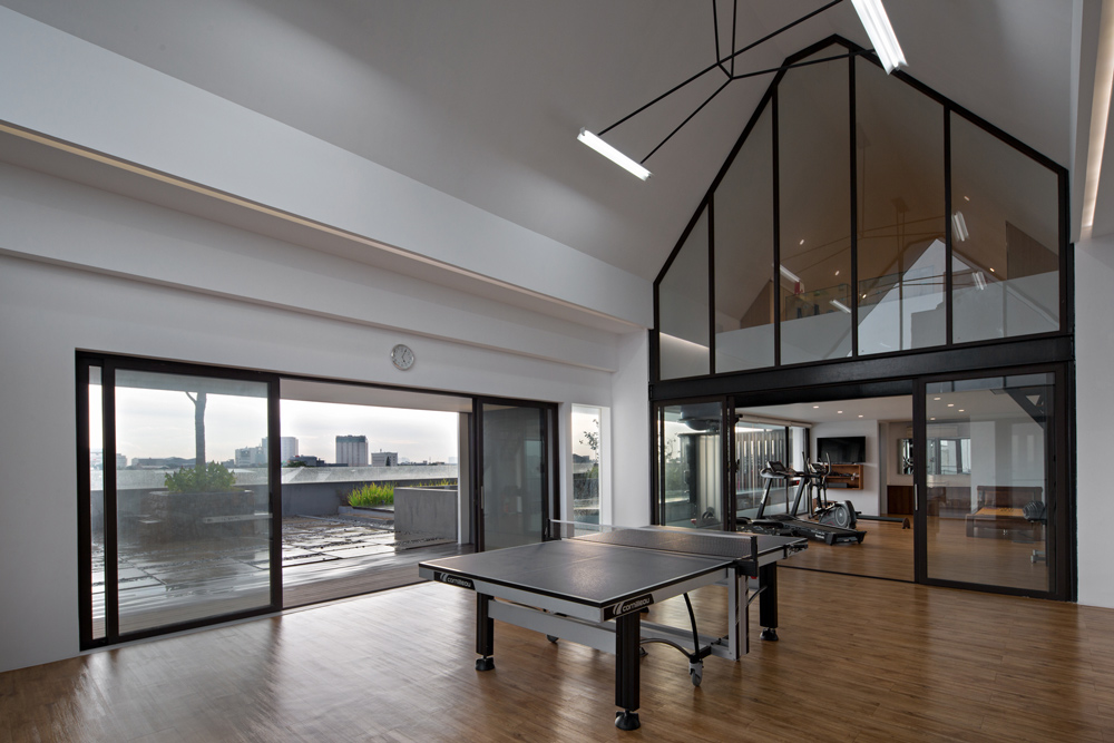 Bangunan hunian sendiri merupakan hasil pembangunan baru sehingga penerapan desain spasialnya dapat disesuaikan dengan kebutuhan penghuni. Pada massa bangunan dengan atap berbentuk trapesium, teknik perancangan atap yang tinggi dimanfaatkan sebagai ruang aktvitas hobi seperti ruang kebugaran dan mezzanine untuk melampiaskan kegemaran penghuni pada permainan lego. Sementara pada atap massa bangunan yang berbentuk persegi dimanfaatkan sebagai rooftop deck dengan lansekap hijau untuk area bersantai.