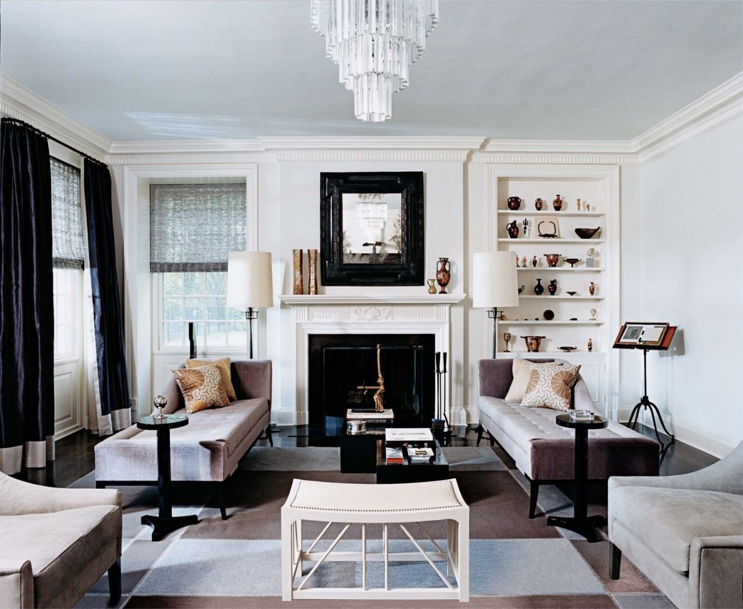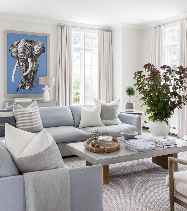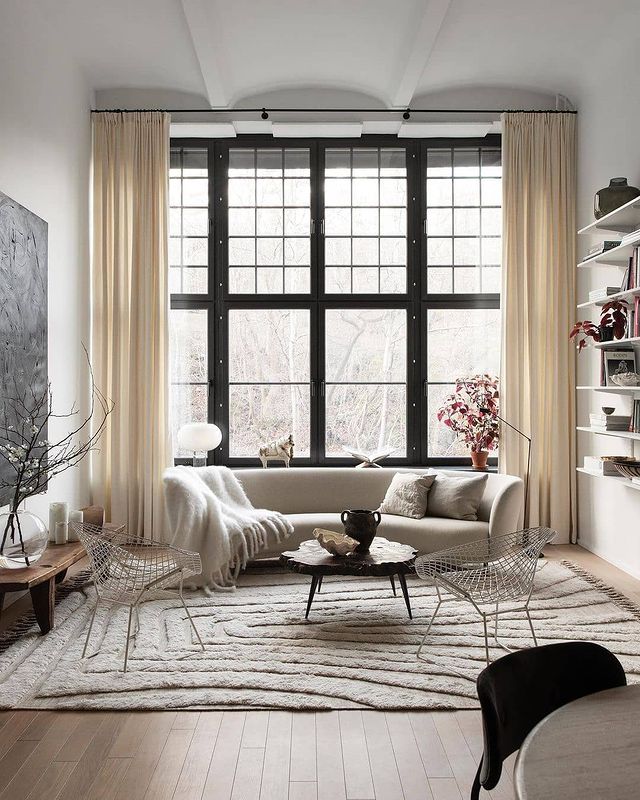 Jika Anda memiliki jendela dengan bukaan lebar, memasang gorden panjang (sesuai tinggai gorden) dengan warna netral polos seperti ini adalah pilihan yang tepat. Pasalnya, itu bisa menjadi fitur arsitektur ruangan yang menonjol, disamping fungsi utamanya. Ini juga bisa menciptakan kesan ruang tamu yang sempit menjadi lebih luas.