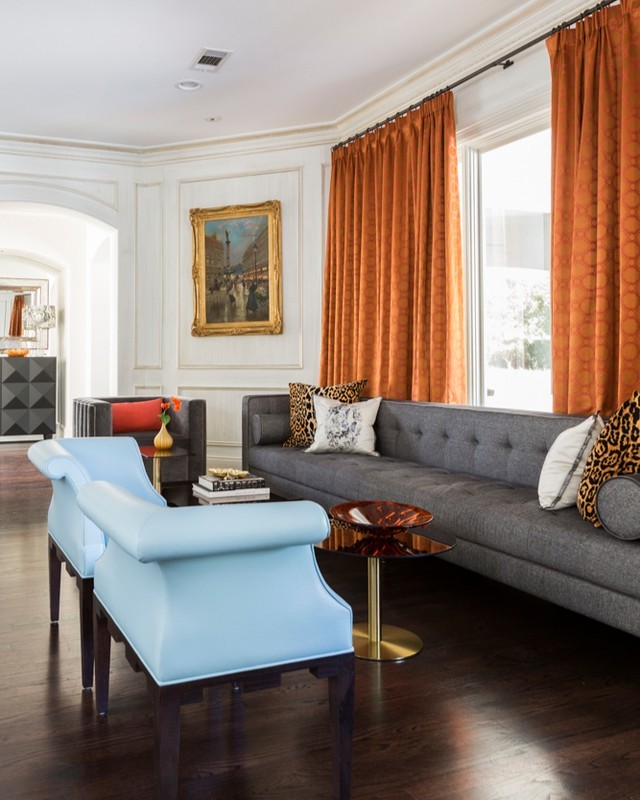 Jika Anda ingin menghadirkan sesuatu yang lebih “berani” dan unik ke dalam area ruang tamu, coba bermain dengan gorden berwarna bold, misalnya oranye. Gorden warna oranye dengan motif simple yang dipadukan dengan dinding putih akan memberikan kontras yang sangat menarik, elegan, dan sophisticated.