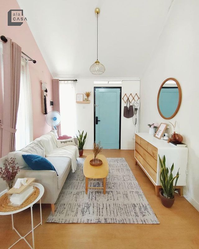 Padukan dengan cat tembok berwarna terang dan netral dan lengkapi dengan furnitur bergaya modern minimalis. Dijamin bikin area ruang tamu Anda semakin estetik!