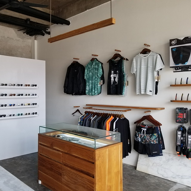 Sebelah kanan toko ada berbagai koleksi brand peralatan dan pernak-pernik surfing yang dijual. Sedangkan, sisi kiri dipenuhi meja coffe bar yang menjual andalan kopi mereka dengan pilihan susu nabati maupun hewani.Â