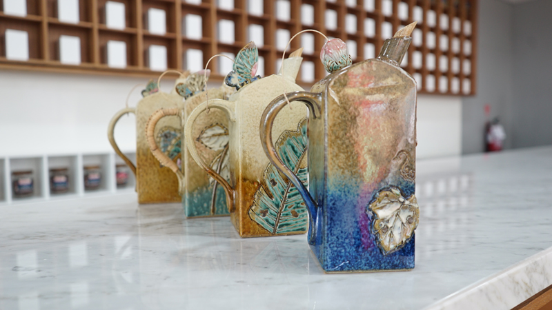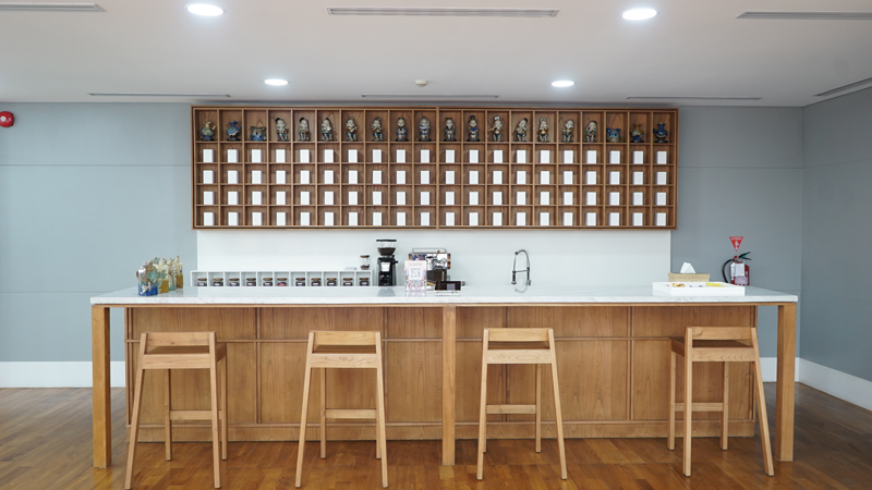 Perbincangan di sini makin terasa santai dengan suguhan racikan kopi dan minuman lainnya oleh barista di area coffee bar yang dikustomisasi menggunakan kayu sebagai material utama. Latar bar diisi dengan deretan panel kotak yang diisi dengan keramik karya seniman ternama F. Widayanto. Karya seni yang hadir di semua PermataBank Model Branch yang kini telah tersebar di kota besar seperti Jakarta, Bandung, Semarang, Kudus, Surabaya, Medan, Bali ini menampilkan wujud flora dan fauna dalam paras earth tone.