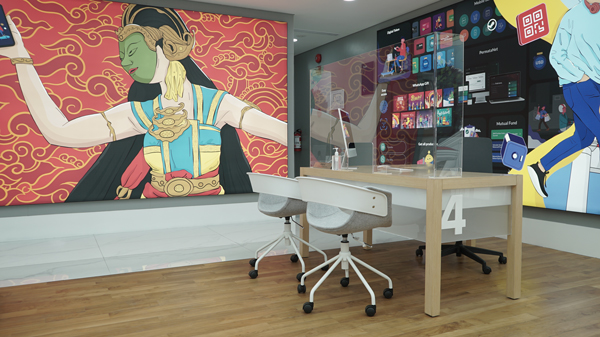 Sesaat melangkah masuk ke dalam bank, Anda akan menemukan ruang yang lega seperti berada di sebuah showroom smartphone berkat stretch ceiling dan minimnya partisi solid penghalang visual saat berada di dalam ruangan.