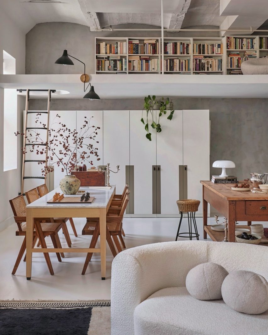 Memiliki ceiling tinggi dalam hunian rumah maupun apartment sangat baik untuk masuknya sirkulasi udara dan pencahayaan lebih baik masuk ke dalam. Seperti dalam loft bergaya industrial ini memanfaatkan sisa ruangan menjadi mezzanine library yang luasnya memenuhi seluruh dinding. Berderetan dengan jendela tersedia tangga untuk akses ke atas, terdapat lemari dan dapur yang menampilkan material marmer dan interior kayu.
