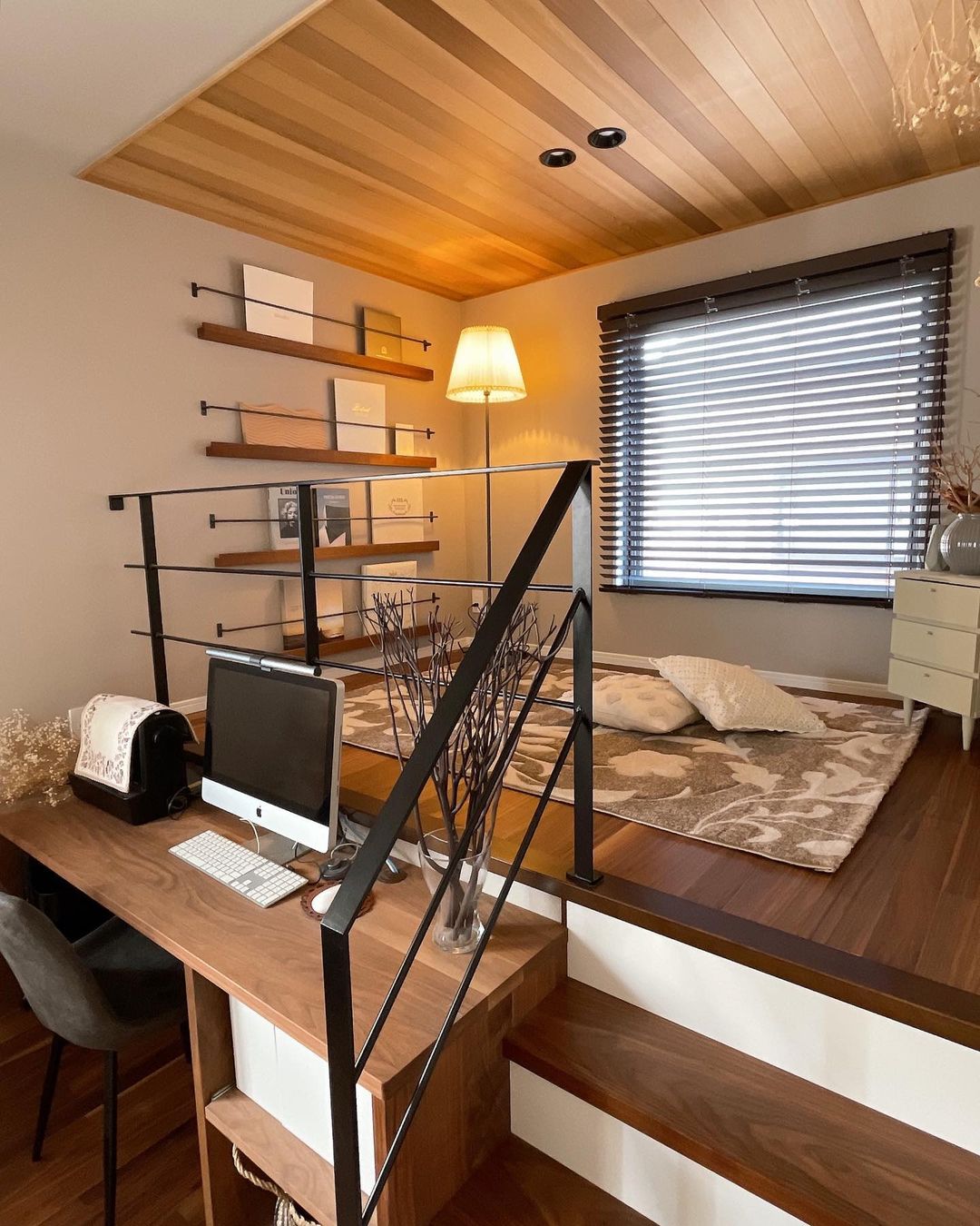 Bagi Anda yang memiliki rumah minimalis dan ingin memanfaatkan setiap ruangnya, bisa mengikuti desain ini menambahkan setengah lantai sejajar dengan meja kerja untuk memperluas volume menjadi tempat membaca.
