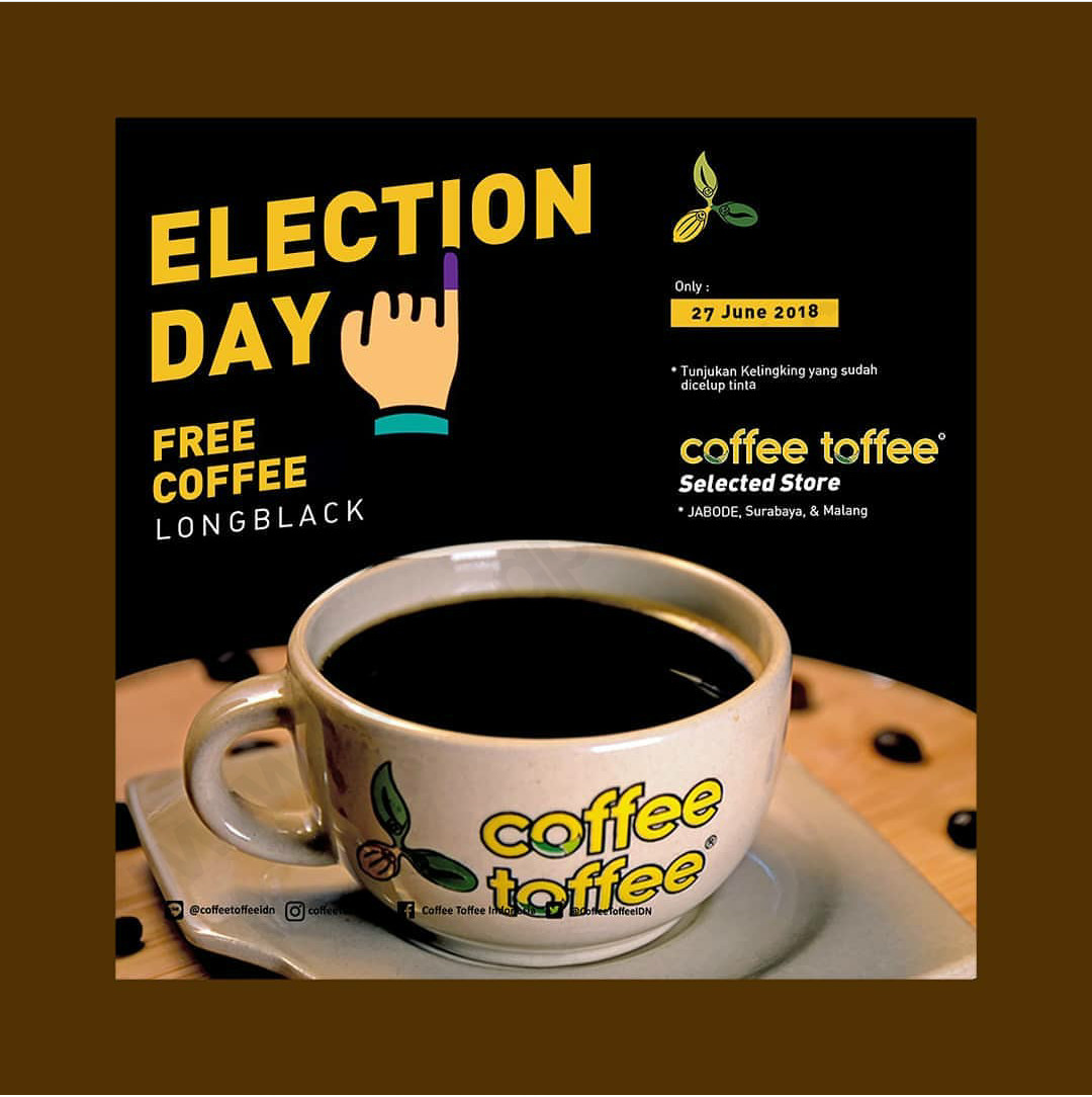 Kunjungi Coffee Toffee di daerah Jakarta, Bogor, Depok, Surabaya dan Malang untuk mendapatkan Coffee Long Black gratis hari Rabu ini. Promo ini berlaku untuk anggota Coffee Toffee dengan kartu reguler dan komunitas serta dengan menunjukan jari bertinta Anda.