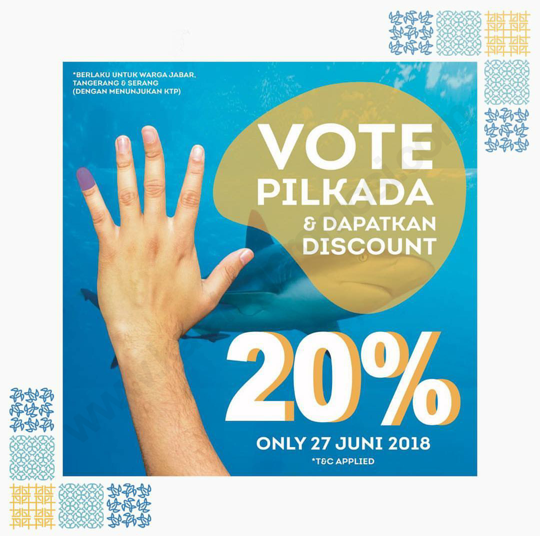 Tidak ada salahnya memilih untuk mengunjungi Jakarta Aquarium di hari libur Anda dan menyaksikan beragam koleksi fauna dari laut. Berlokasi di Neo Soho, pusat perbelanjaan di Jakarta Barat, Neo Soho menawarkan promo di hari Pilkada 2018 ini. Tunjukan jari bertinta beserta Kartu Tanda Penduduk (KTP) asal Jawa Barat, Tangerang, dan Banten, maka Anda dapat menikmati potongan harga sebesar 20% untuk tiket masuk Jakarta Aquarium.