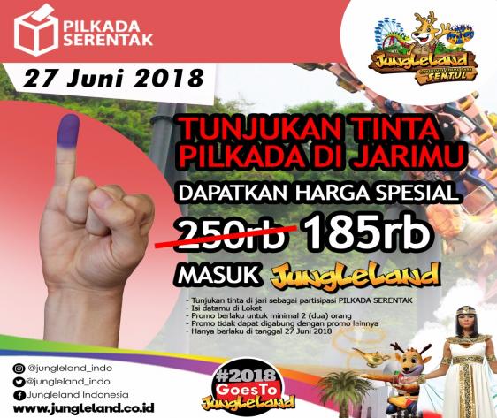 Jadikan momen waktu libur ini sebagai waktu untuk menantang diri Anda. Nikmati wahana-wahana seru di Jungleland, Sentul, Bogor pada 27 Juni 2018 dengan promo harga spesial untuk tiket masuk, yaitu Rp 185.000 dengan menunjukan jari bertinta Anda usai mencoblos.