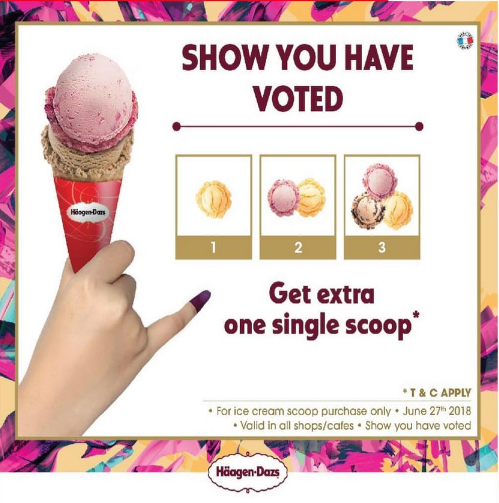 Jangan lewatkan kesempatan untuk mendapatkan extra scoop dari Haagen-Dazs setelah selesai menggunakan hak suara Anda. Nikmati promo ini dengan menunjukan jari bertinta Anda saat mengunjungi kafe Haagen-Dazs.