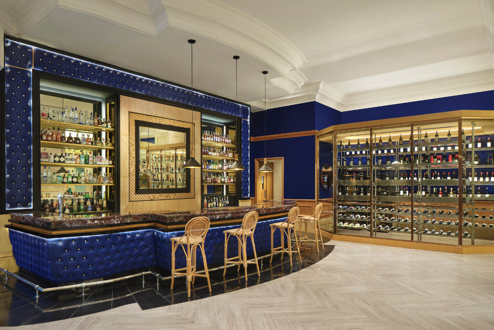 Desain interior Lobo & Juno yang elegan dengan sentuhan furnitur bergaya tropis Indonesia dengan semburat biru pada beberapa sisi dinding dan island di bar