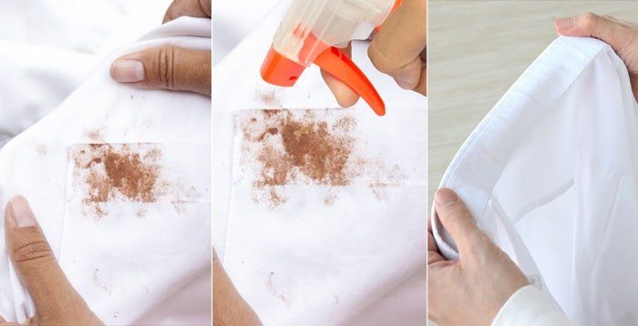 Rendam pakaian dengan air dan deterjen pemutih yang memiliki kandungan hidrogen peroksida, atau masukkan cairan pemutih ke mesin cuci, lalu bilas setelah satu jam direndam, kemudian cuci seperti biasa. Atau, sekarang sudah ada produk yang berbentuk pena untuk penghilang noda pada baju.