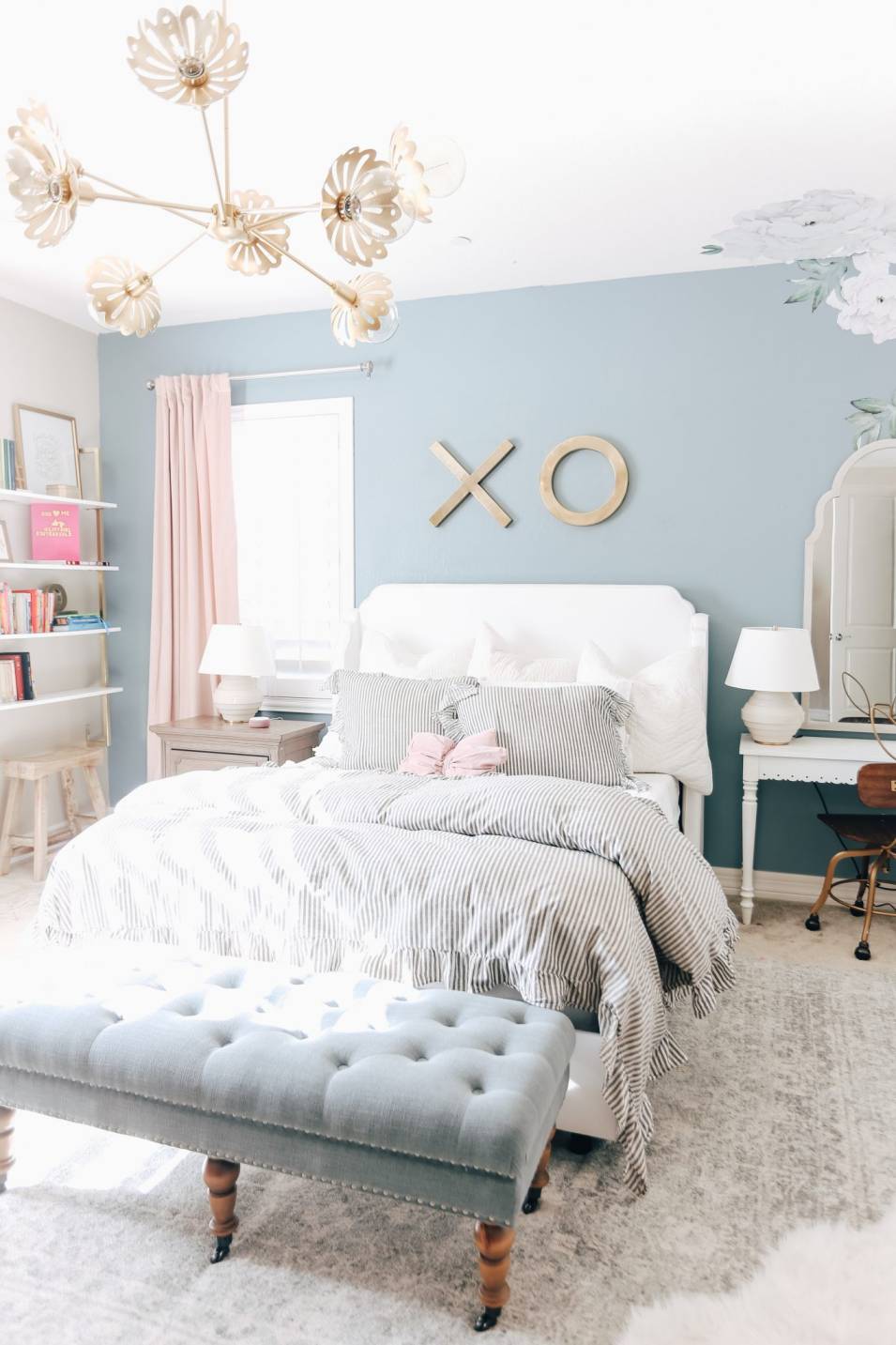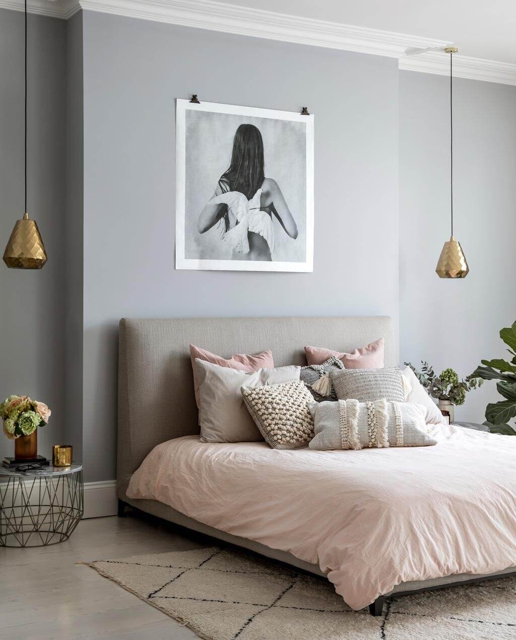 Anda mungkin tidak pernah berpikir bahwa soft gray akan sangat cocok dengan warna gold dan pink. Padahal, warna abu-abu pada dinding kamar tidur memberikan latar belakang yang lembut, terasa friendly dan hospitable untuk aksen emas dan merah muda.